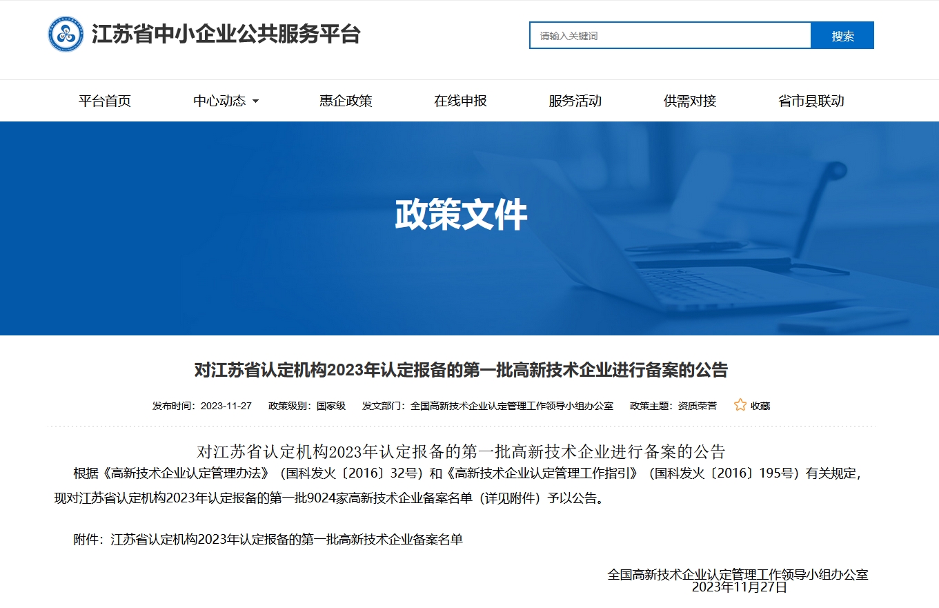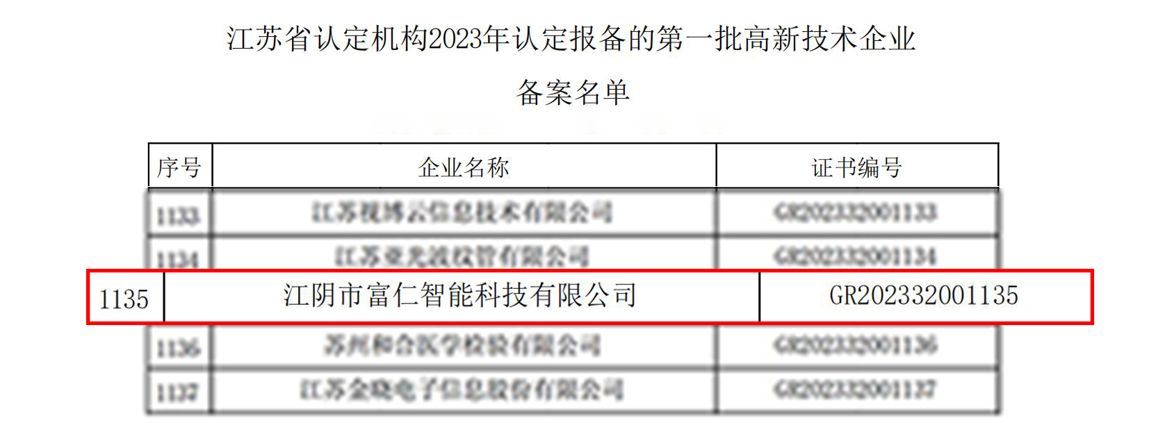 日前,全國高新技術企業認定管理工作領導小組辦公室發布《對江蘇省認定機構2023年認定報備的第一批高新技術企業進行備案的公告》名單,江陰市富仁智能科技有限公司位列其中,正式被認定為國家高新技術企業。