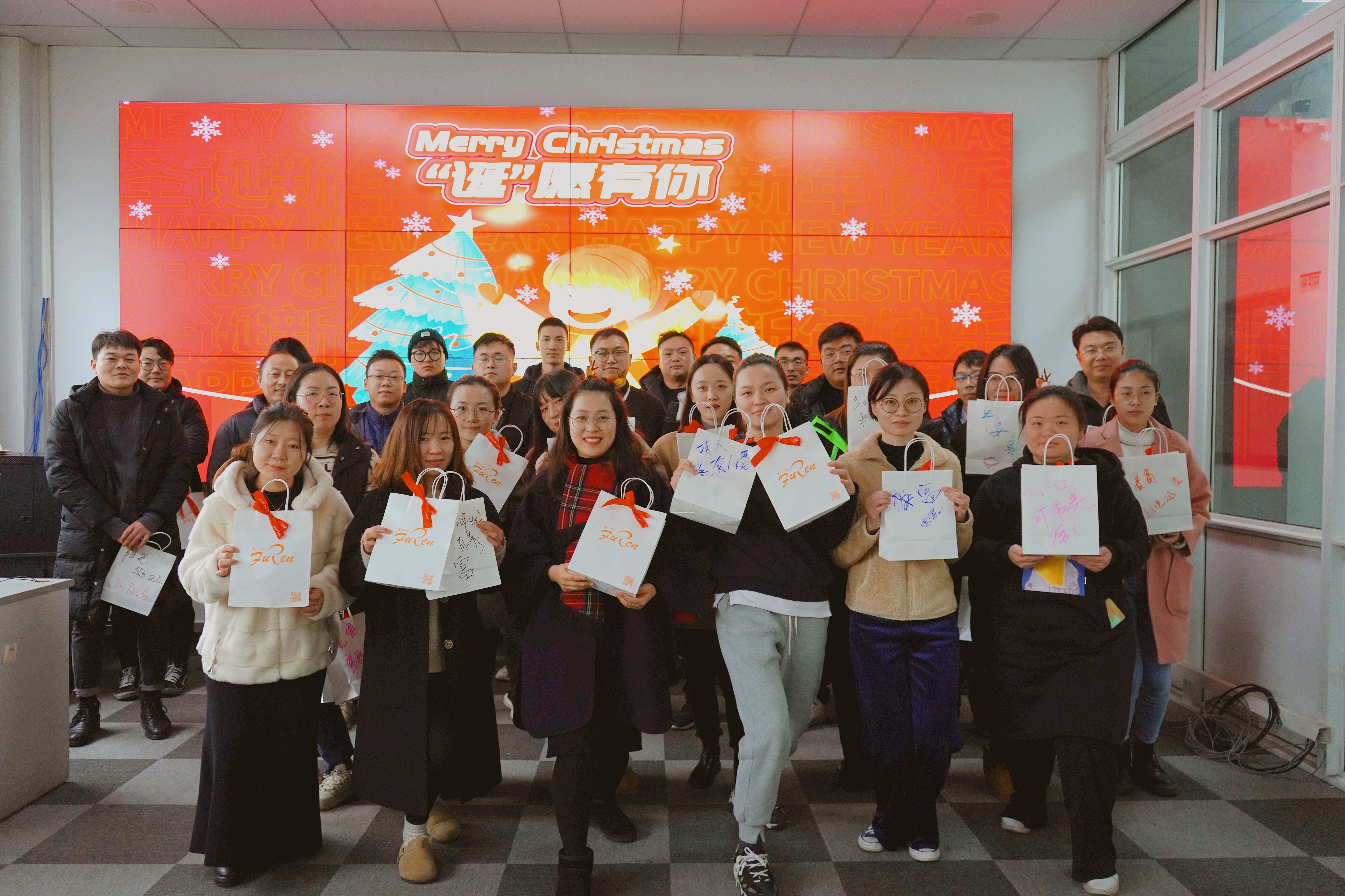 平安夜當天,一份份禮物整齊地擺放,等待著大家把祝福帶回家。大家仔細挑選最適合自己的祝福語,享受著這獨一份的快樂。收到禮物的大家臉上滿是藏不住的笑意,幸福感滿滿。“禮輕情意重”,每一份小禮物都包含著富仁智能對員工的祝福,“誕”愿努力的你們都能夢想成真。