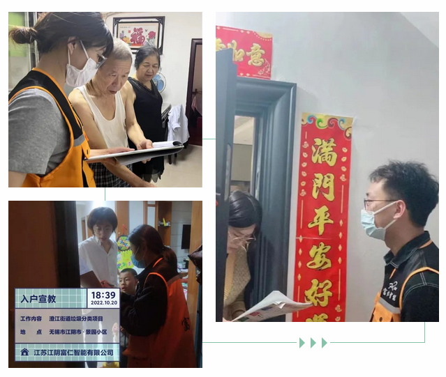 在項(xiàng)目落地初期,為打消居民對(duì)垃圾房臟亂差的固有印象,支持“三定一督”分類屋的建設(shè)工作,通過(guò)入戶宣傳的方式,富仁智能向該小區(qū)每一戶居民宣貫垃圾分類對(duì)江陰城市更新項(xiàng)目的重要性,并廣泛征求居民對(duì)垃圾分類屋建設(shè)的意見和建議,確保垃圾分類屋點(diǎn)位選址合情合理。同時(shí)還向居民發(fā)放了《生活垃圾分類投放指南》,充分說(shuō)明“三定一督”垃圾分類運(yùn)營(yíng)模式,為后期的督導(dǎo)運(yùn)營(yíng)工作做鋪墊。
