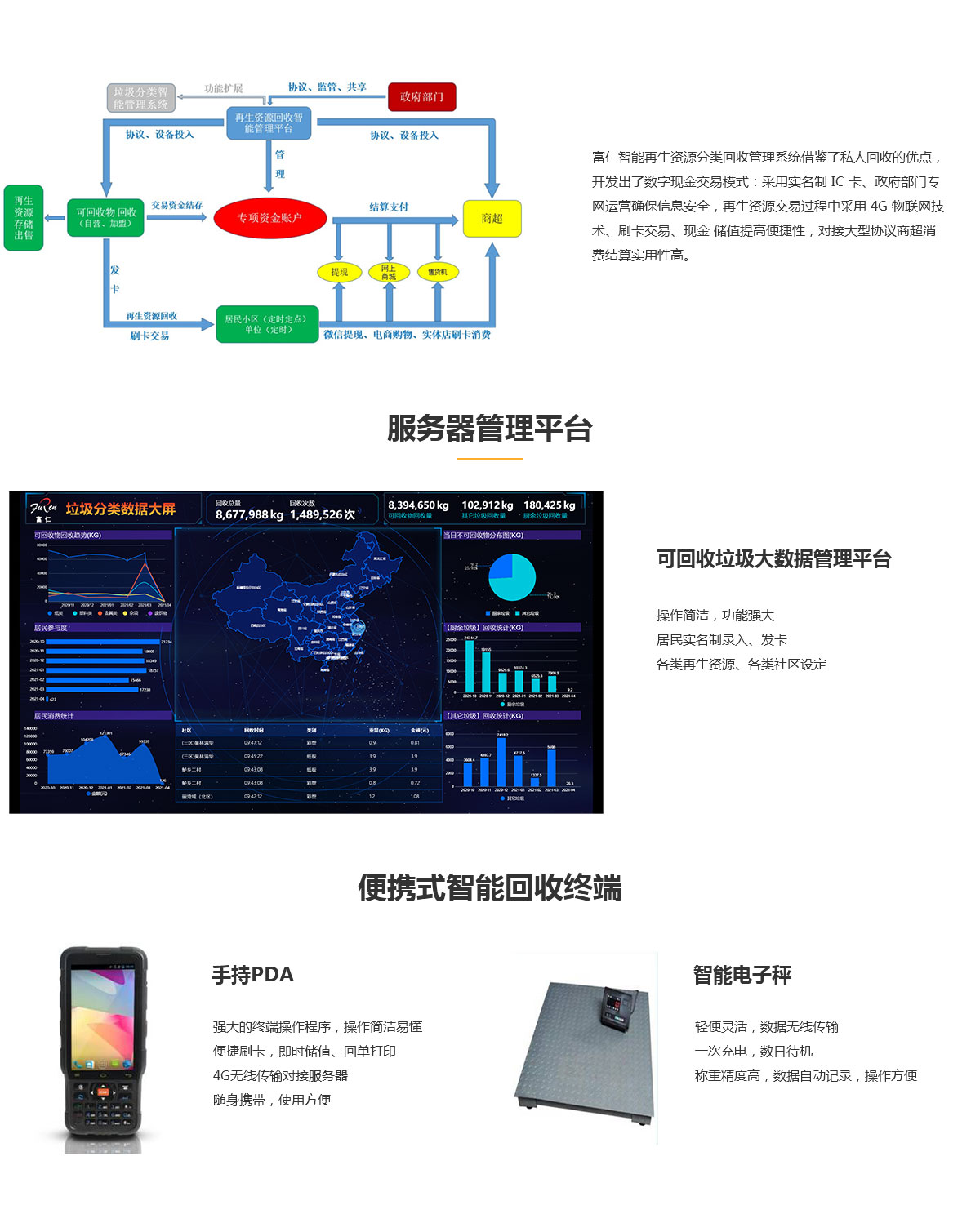 富仁智能再生資源回收管理系統主要是針對政府管理部門(或再生資源回收管理公司)在資源回收工作中使用。通過建立信息化管理平臺,使得相關部門可實現再生資源的全面覆蓋回收、監測;大幅降低人力成本, 節約寶貴資金,提高回收效率;減輕了從業人員的工作強度;通過便捷的交易方式,大幅提高社區居民的參與程度,促進了城市環境衛生建設。